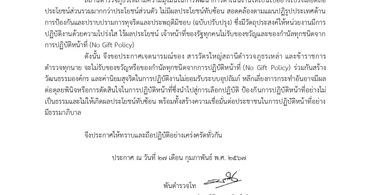 สถานีตำรวจภูธรเหล่า ประกาศเจตนารมณ์ที่จะไม่รับของขวัญหรือของกำนัลทุกชนิดจากการปฏิบัติหน้าที่ (No Gift Policy)